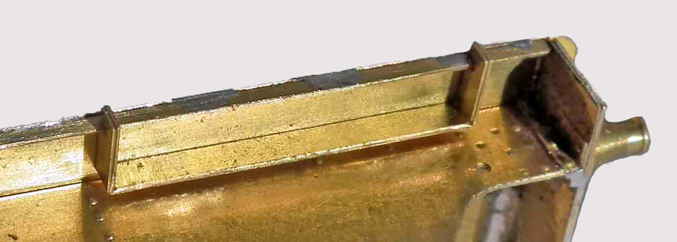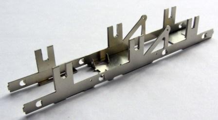 Replacement tender frames The Bachmann tender frames are spaced a lot further apart than on the prototype due to an over allowance for the thickness of 00 wheels and to the thicker frames. This results in the axleboxes being too shallow. The replacement frames, top plate, drag and buffer beams fit in place of the Bachmann originals, and in turn, the EasiChas frames fit to the underside of the replacement frames. The replacement frames still allow the tender to negotiate 3 foot curves in both EM and P4. There are two types of tender underframes. The type that comes with the Bachmann loco is the last Bowen Cooke type, referred to in Talbot’s book as BC4. An earlier version, BC3, had the same body but the frames were to a Whale design and these tenders were common on the G1, G2 and G2A locos. A separate etch for these frames to produce a BC3 tender is available from Brassmasters (ref B244). 9.1 Push through all the rivets in the tender frames [F1]. There are a lot of them. 9.2 Fold over the five tabs on the base of the tender frames [F1] back on themselves (see photo). Ensure they are completely flat. |