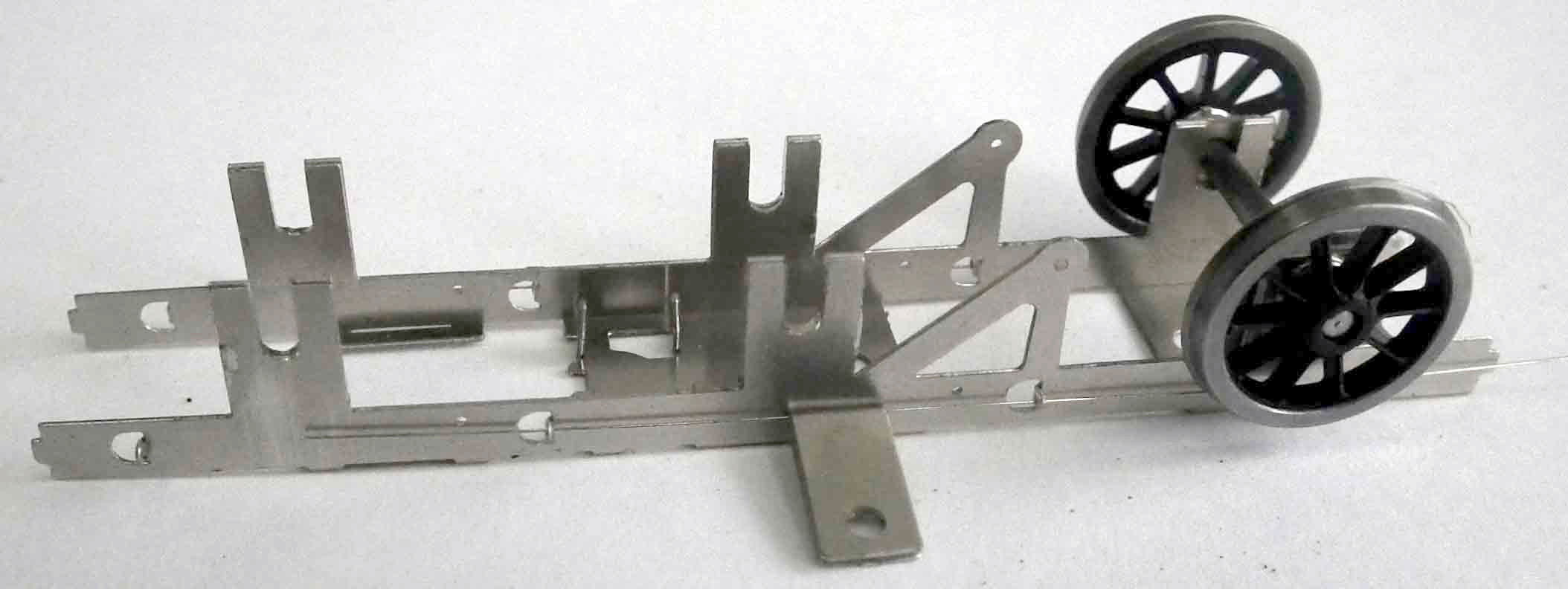 6.11 Mount the wheelsets in the ‘U’ slots on the frames with the axleboxes on the outside of the frame. 6.12 Take the thin 8 thou steel spring and put a 2mm right angle bend in the end, cut to 77mm long and then slide the thin 9 thou steel spring wire through the frame ears and holes in the axleboxes (this is a bit of a fiddle!). Bend over the end of the wire to retain. See Photo. 6.13 Fit the frames to the Bachmann tender, locating and refit the tender top. Secure in place with the original coupling post screw through the rear hole in the frames. This is sufficient to retain the frames. 6.14 Ensure that the tender runs smoothly and that all the axleboxes are free to move up and down. Adjust the Bachmann tender coupling to suit your model curves. 6.15 Re-assemble the tender. The loco tender coupling has quite a bit of slop in it. If desired, solder a 2mm washer to the bottom of the coupling link over the rear hole. This then slides onto the tender pin without slop. The basic tender conversion is now complete, but significant visual improvements can be made by replacing the tender brake gear, see section 8. |