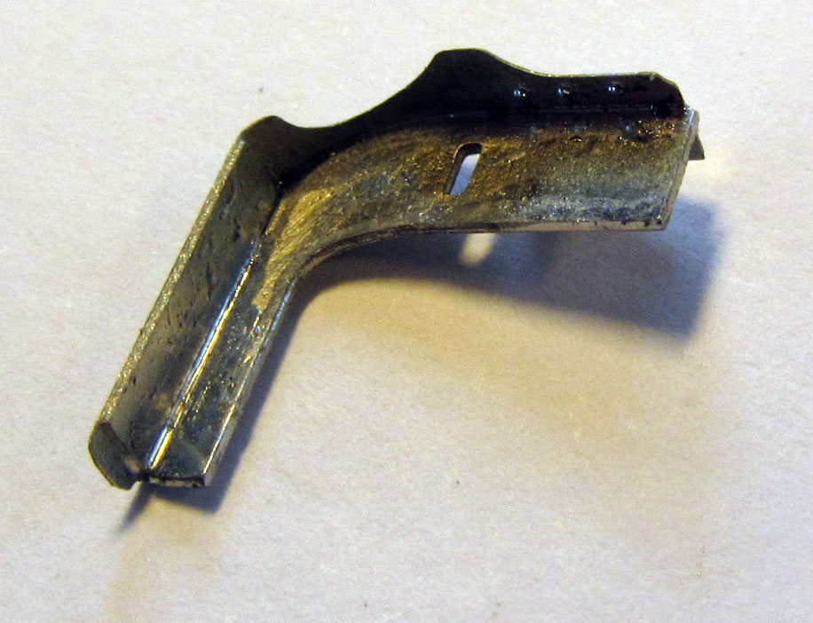 9.3 Fold up the sides of the tender frames to 90 degrees, then fold up the two mounting guides to 90 degrees. Strengthen these last two with solder. (note photo shows BC3 frames but construction is identical) 9.4 Make sure that the Bachmann adjustable tender coupling will fit through the gap of the leading mounting guide – it will probably need a gentle dressing with a file. 9.5 Reduce the head diameter of the Bachmann body retaining screws by holding them in a pin chuck and rotating them against a file 9.6 Ensure the four tabs on the top of the frames [F1] engage in the slots in the tender footplate [F2]. Solder the two together through the various slots between the frames not along the side of the frame (otherwise this may affect the fitting of the rivet strip later). Make sure the top face of the footplate is completely flat. 9.7 There are two types of buffer beam, the normal flat type and the riveted type which was fitted to a few tenders. Identify which of the two types is required ([F3] for the flat type, [F4] for the riveted type. 9.8 Take the buffer beam back [F5] and push through the rivets. Solder the buffer beam front [F3 or F4] and the buffer beam back [F5] together. 9.9 If re-using the Bachmann plastic buffers, push through the rivets on the back of the buffer bases [F6] and solder them in place on the buffer beam. 9.10 AT THIS POINT IT IS IMPERATIVE THAT YOU OPEN OUT THE HOLES IN THE BUFFER BEAM TO SUIT YOUR CHOSEN BUFFERS. If using replacement brass buffers, solder to the bufferbeam and file back so the rear of the bufferbeam is flush. 9.11 Solder the buffer beam assembly to the tender base and frames ensuring the it is the correct way up (the buffer holes should be towards the bottom of the buffer beam when fitted). You will probably also have to open the hole in the brass buffers out with a 0.5mm drill as solder will have flooded the hole. |