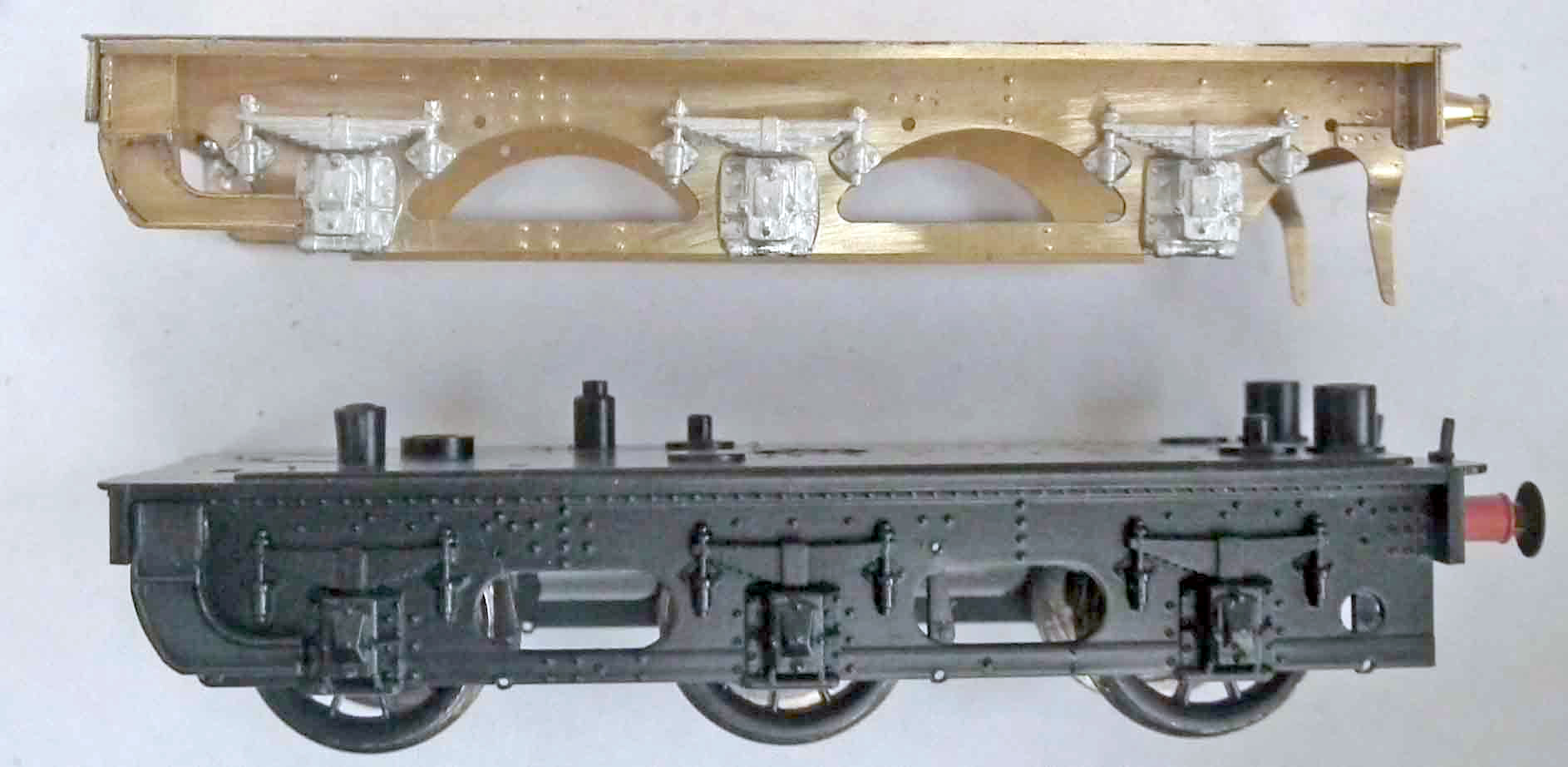 9.28 Cut the axlebox and spring hanger assemblies from the Bachmann frames using a piercing saw. Reduce the thickness of the back of each assembly, and then attach to the replacement frames (see photo). Note - a better method is to fit new whitemetal axlebox and springs - available separately from Brassmasters (ref B245) (see photo which is actually of a BC3 framed version) 9.29 Solder the two footstep assemblies to each side of the frames. 9.30 Take the guard irons ([F24] for the left hand side and [F25] for the right hand side), push through the rivets from the rear, curve to shape and solder in position on the inside of the tender frames. 9.31 If using with the EasiChas tender frames, solder an 8 BA nut in the recess on the top centre of the tender footplate [F2]. Solder the Bachmann loco coupling nut over the hole towards the front of the footplate. 9.32 Remove the Bachmann fall plate from the tender body by unbending the two tabs. Insert the two tabs in the thin slots in the new footplate and bend over the tabs. 9.33 Fit the locomotive coupling in place using the original Bachmann screw and then attach the EasiChas frames to the footplate frame assembly using an 8BA screw. Finally, fit the tender body in place by insetting the two tabs into the slots at the front of footplate and securing in place using the two original Bachmann screws through the two rear holes. |
